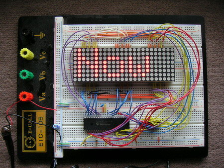エレキジャックNo.4にあった電光掲示板を作ってみました。本当は基板にはんだ付けで小さくつくるのですが、面倒だったのでブレッドボードで組みました。