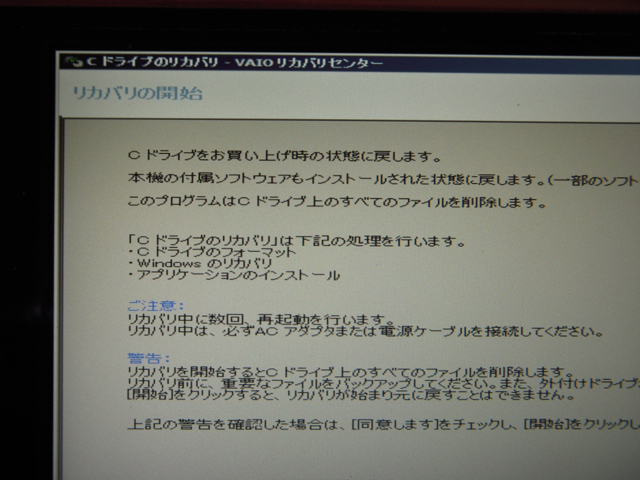リカバリには以前作ったリカバリCDを使うのかなと思ったら、SSDにあるリカバリ領域のデータをつかって工場出荷状態にリカバリできるんですね。最近のノートPCは便利ですなぁ。