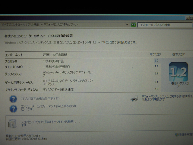 気になるのはWindowsエクスペリエンスインデックスのスコア。プロセッサの値が1.2と異常に低い値に見えます。VISTAで計ったときはプロセッサは3.0だったように覚えているのですが、どうしてでしょうね。CPUはVAIO type Pでは最速のAtom Z540 (1.86GHz)です。