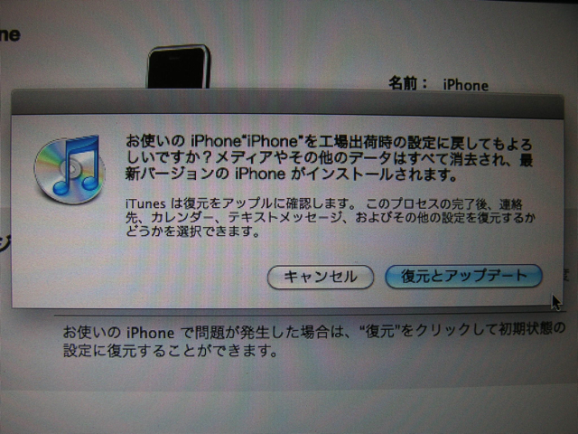 iTunesでMacにiPhoneのデータはバックアップされているとは思うのですが、さすがに冷や汗ものです。でも、これをしないと先に進まないので、思い切って「復元とアップデート」を行いました。