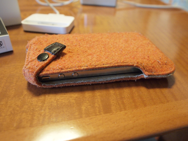 次はケースです。iPhone 3Gで使っていたbuzzhouse designさんのハンドメイドフェルトケースが、iPhone 4でそのまま使えるかという不安があったのですが、buzzhouse designさんに問い合わせたところ、「生地や縫い目が馴染んでいるので、恐らくお使いのケースにiPhone4を入れるとぴったり位かと思います。」という回答通り本当にピッタリでした。慣れているケースがそのまま使い続けられるので良かったです。