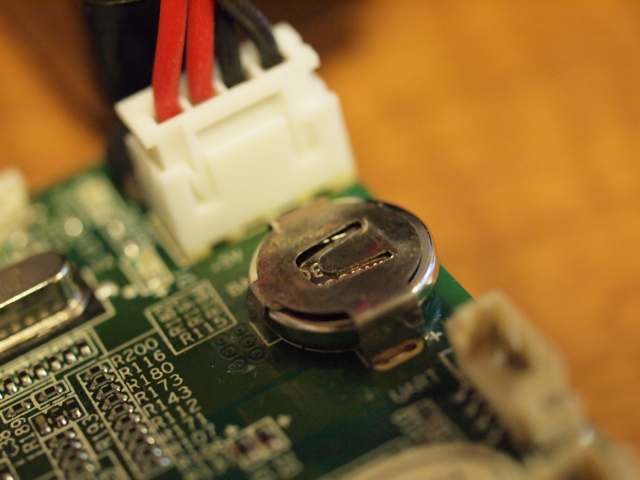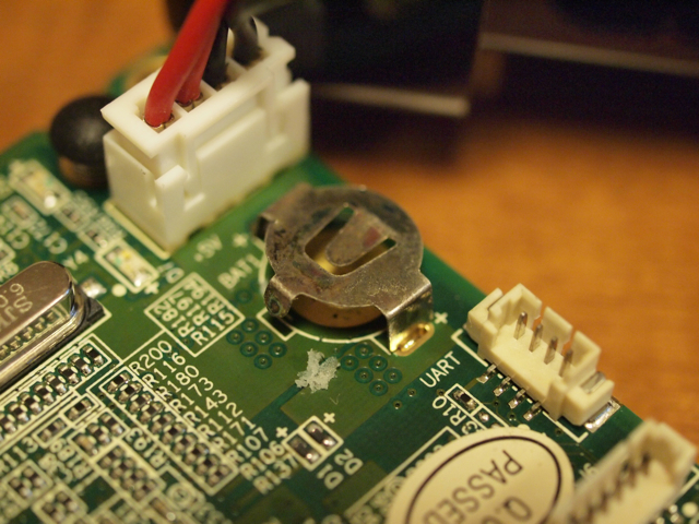 ふたを開けたところ、基板の上に実装されているボタン電池(AG10)が液漏れしていました。