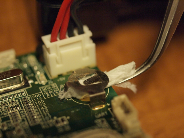 とりあえず、ピンセットで液漏れした固形物を取り除き、ティッシュと綿棒で端子を掃除しました。