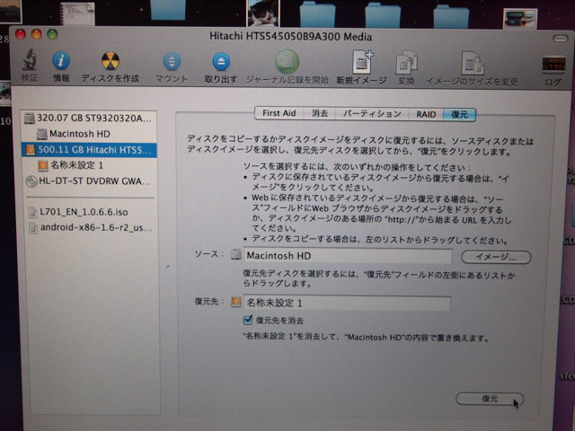 次は復元を行います。ソースは起動ドライブ、復元先はUSB接続した新しいハードディスクです。