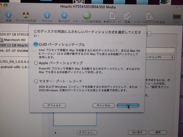 ここで初期化のボタンを押すと、ディスクユーティリティの画面になります。ここで新しいパーティションを作成しますが、念のためオプションボタンを押して、GUIDパーティションテーブルになっているかを確認します。