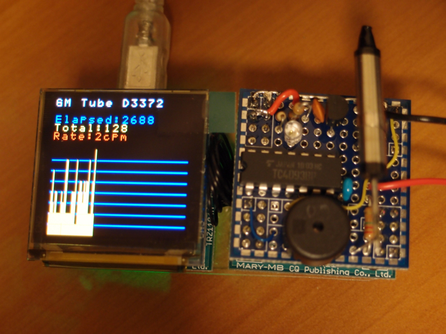 MARYシステムのCB基板(ユニバーサル基板)に秋月で購入したGM管 D3372を載せてみました。さすがに高圧発生部(600V)は外付けです。