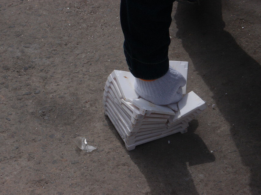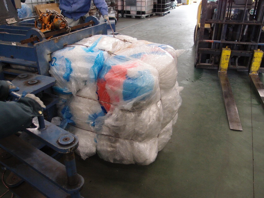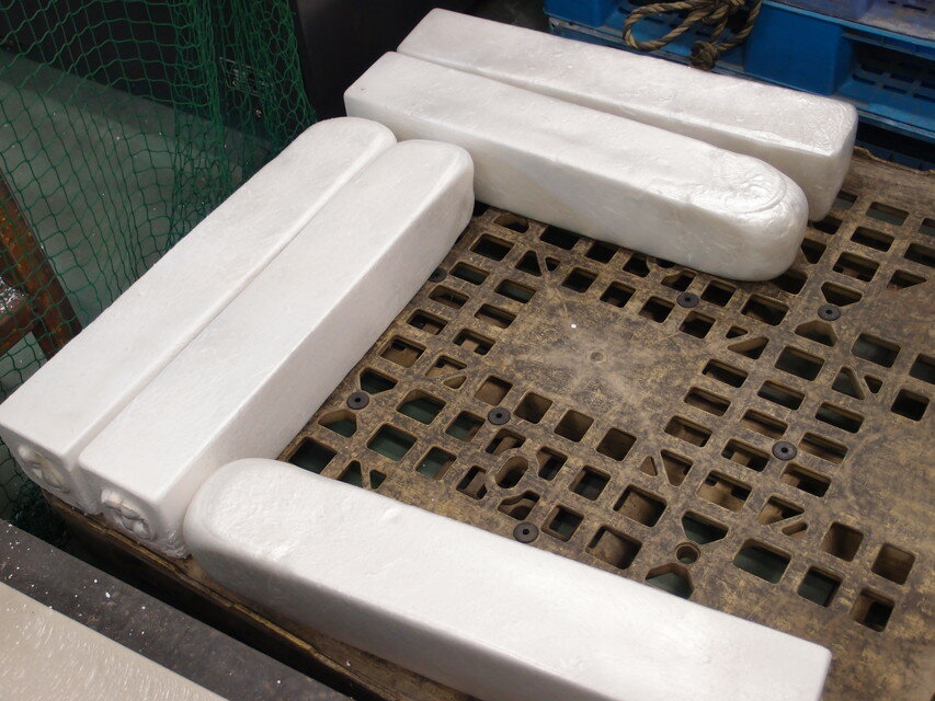 こちらも沢山発砲スチロールをいれすぎて機械が止まってしまいました。投入限度を明確に決めておいたほうが良さそうです。溶融された発砲スチロールはこのような塊ででてきます。