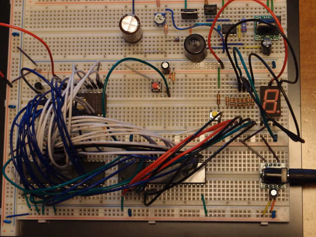 早速組み立てです。40P DIPを2個使いますので、少し広めのブレッドボードを使わないといけません。また同じボード上でサンプルプログラムにあるDice Gameの回路も実装します。組み立てた結果はまるでジャングルになりました。