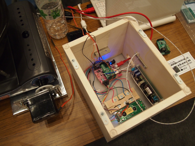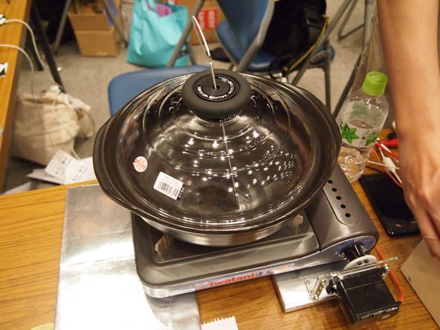 土鍋でおいしいご飯を炊くための仕掛けです。鍋に取り付けた温度センサーの情報からマイコンでサーボを制御してガスコンロの火加減を調節するというちょっと危険な香りのする作品です。