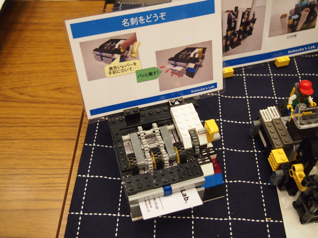 レゴで作った名刺配布機です。レバーを倒すと名刺が1枚でてきます。簡単な構造ではありますが、レゴをうまくそして奇麗に使っています。動力はゴムだけです。