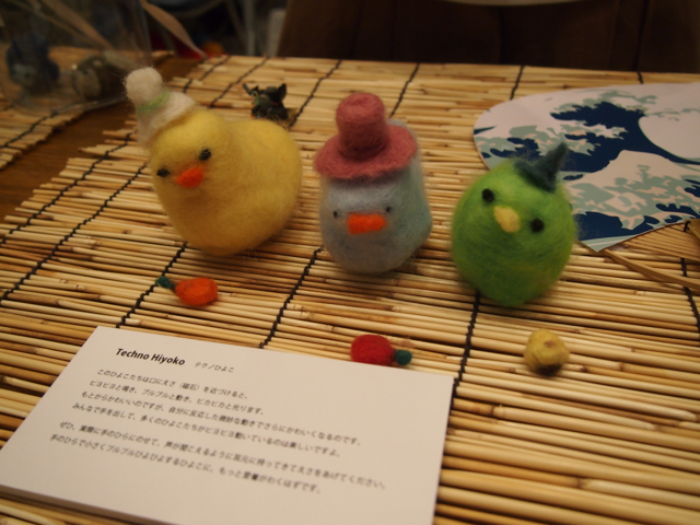 くちばしの近くに餌を近づけると鳴いたり光ったりします。餌は磁石になっていて、頭にあるリードセンサーが反応していろんな動きをします。ひよこの頭にいれるために制御基板は小さく作ってありました。(ひよこの後ろに小さく写っています。)