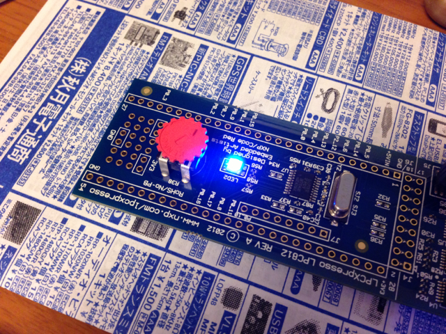 ターゲットボードにLPC812がちょこんと載っています。ターゲットボードにはカラーLEDとボリュームも載っていて、予め書き込まれている動作確認用のプログラムで、ボリュームを回すとカラーLEDの点滅パターンがいろいろ変わってまるでクリスマスツリーのLEDのようです。