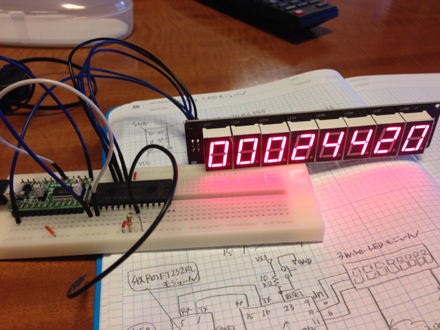 mbed LPC1114FN28で秋月電子の3-Wire 8桁7セグLEDモジュールを動かしてみました。