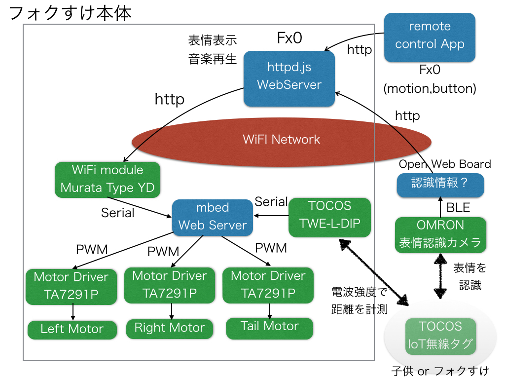 TOCOSのIoTモジュールはシリアル通信で無線タグの情報が取得できるので、キャタピラ基台を制御しているmbed LPC1768にシリアル接続することにしました。HVC-CはBLE通信になりますので、これに対応できるのはOPEN WEB BOARDかなということで、OPEN WEB BOARDでHVC-Cから表情の情報を取り込むことをめざしました。
