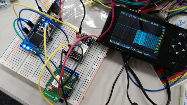 しかし、両方とも初めて使うデバイスであり作業は難航。私が担当したmbedとTOCOS TWE-Lite-DIPの接続の部分はWiFiを使いながらTOCOS TWE-Lite-DIPのシリアル通信を割り込み処理しようとするとハングアップしてしまいます。ARMの雪だるまさんの応援もいただいて、持ち込んだポケットオシロスコープで信号を確認しながら進めましたが、結局原因不明で途中で断念してしまいました。
