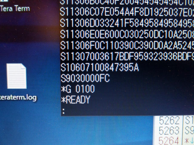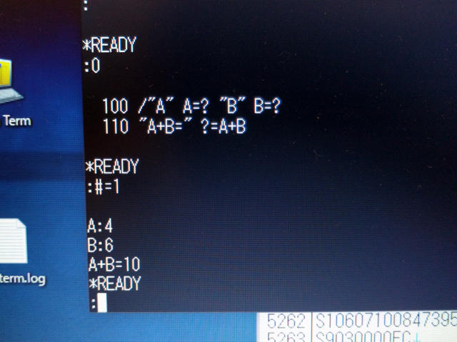 MIKBUGで入力を完了後にSフォーマットで出力して保存しておきます。その後、$100番地から実行すると、「*READY」という文字が表示され、「:」の入力待ちプロンプトが表示されました。