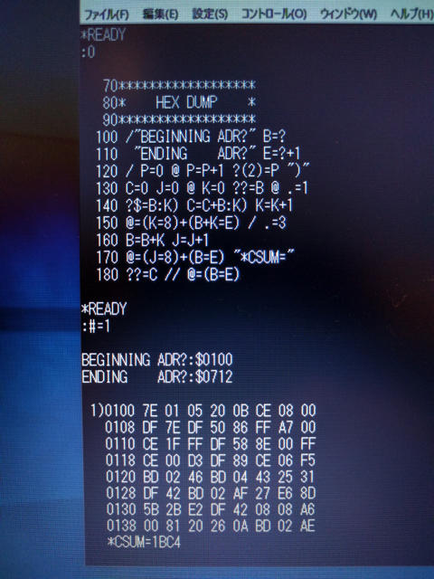 次にメモリダンププログラムを入力してみました。これはアスキー誌に掲載されていたGAMEのダンプリストを作成するためのものです。