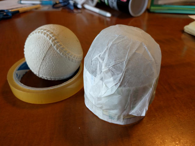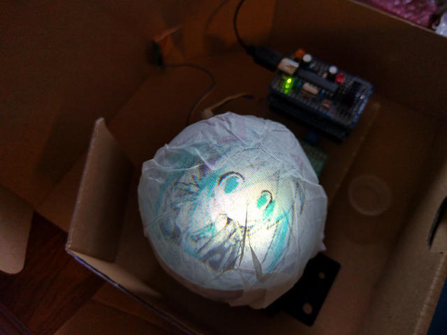 今回使っているドームスクリーンですが、仕様書通りに作りなおしたものです。スクリーンはクッキングシート、丸い形は野球のボールで形を作り、少し厚めの紙を円筒にしたものにスクリーンをセロテープで貼り付けました。これで以前よりは安定して表示できるようになりました。