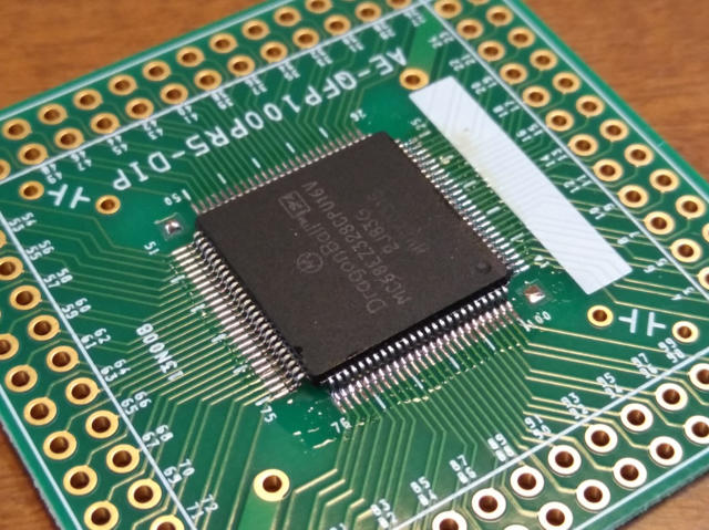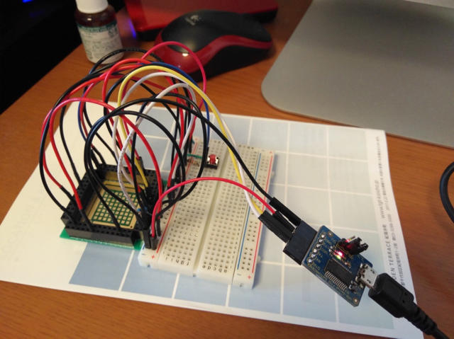 まずはCPUを秋月電子のQFP100変換基板に実装し、ブレッドボードを使い32.768MHzの水晶とリセットスイッチ、USB-シリアル変換ボードを接続しました。電源は3.3Vですが、USB-シリアル変換ボードから50mAまでは取れるのでこれをつかいました。