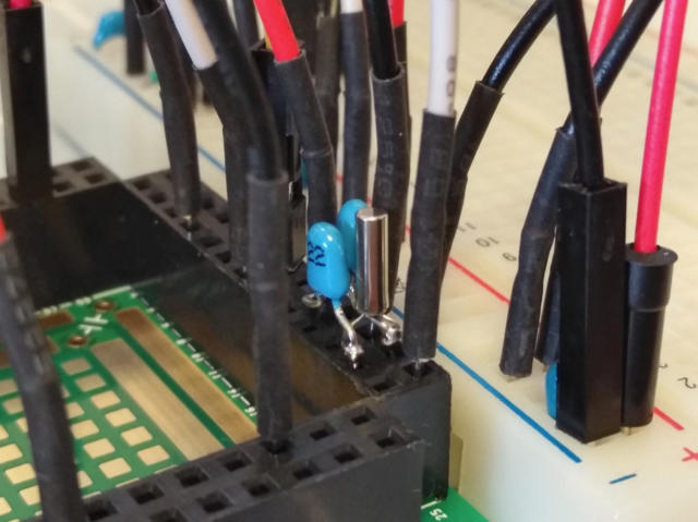 ただし、水晶はなるべく短い配線にすべきなのでピンソケットにそのまま差し込める形で実装しています。