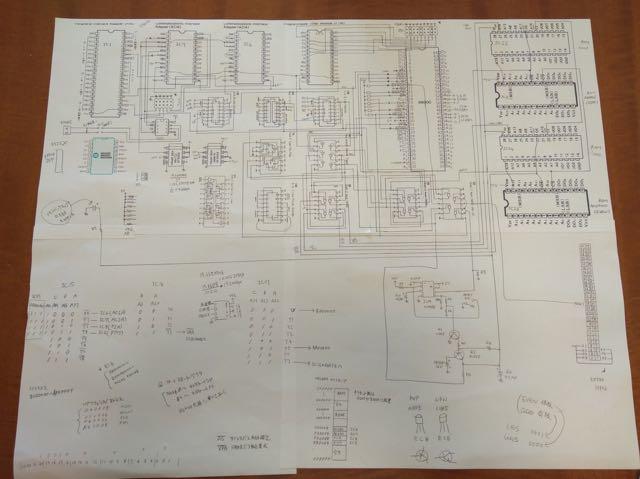 まずは回路図を書くために、各デバイスのピン配置をデータシートから抜き出して、基板のICの配置に合わせて大きめの紙に貼り付けます。今回データシートはCQ出版で公開されている‘86年度版 主要IC端子接続早見表【PDF版】を使って写真のように切り貼りしました。