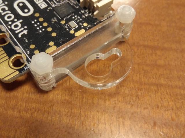 micro:bitにとりつけると、こんな感じになります。透明アクリルで内部の視認性は高いです。