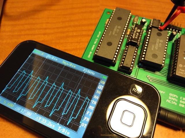 PICが正常に動いているかを確認するために出力端子にポケットオシロスコープを接続し、波形と周波数を確認したところ154KHzでしたので正常に動作しているようです。
