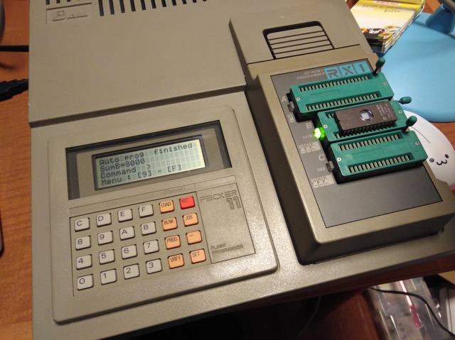 次は動作確認用のPROMの書き込みです。昔ながらの丸い窓のついた紫外線消去型のPROMを愛機Pecker-11で書き込みます。