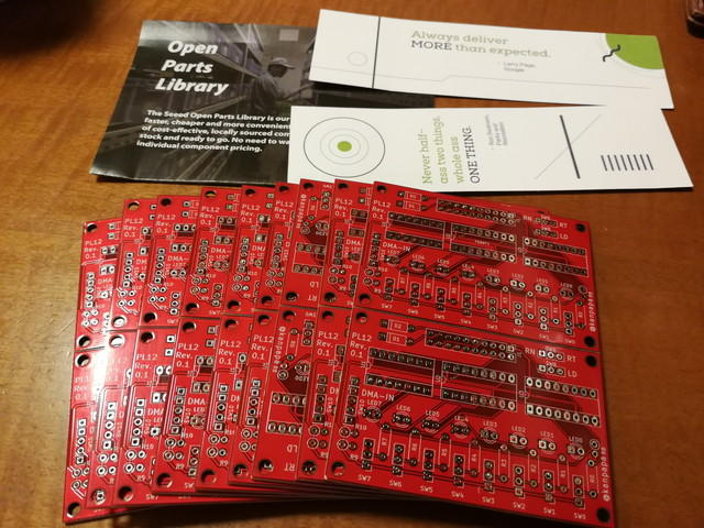 その2~3日後にプログラムローダー基板が到着しました。こちらも5枚のはずだったのですが、なぜか9枚入っていました。他にもパンフレットとかしおりとか入っていました。初めてのV-Cutも問題なさそうです。しかし赤い基板はカッコいいですね。