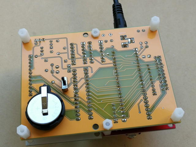 また、シールド基板と干渉しないようにバッテリとメモリスタンバイスイッチを裏面に実装しています。コネクタもメス型のヘッダピンにしました。