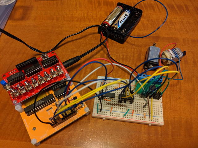 COSMACのプログラムローダー基板にあるトグルスイッチの値を読み取り、その値をモータードライバに伝えることにします。これで4つのトグルスイッチで2つのモーターを自在に制御できるはずです。