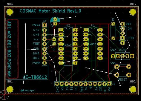 COSMACでDCモーターを制御してみました。モータードライバは各社から出ていますが、ブレッドボードでも手軽に実験ができそうな秋月電子のTB6612使用 Dual DCモータードライブキット\[AE-TB6612\]を使うことにしました。いつものようにブレッドボードで試作し、動作確認をしたところで基板化します。