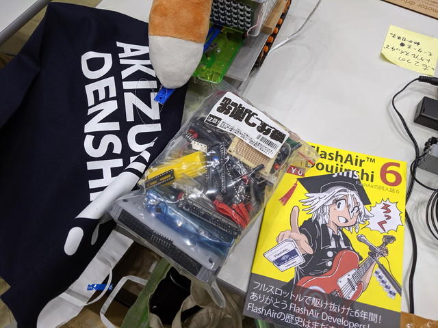1日目は全く他の展示を見ることができなかったので、残りの30分で開場前の会場をぐるりと回りました。これだけはと思っていたFlashAir同人誌6と秋月電子のお楽しみ袋を購入できました。