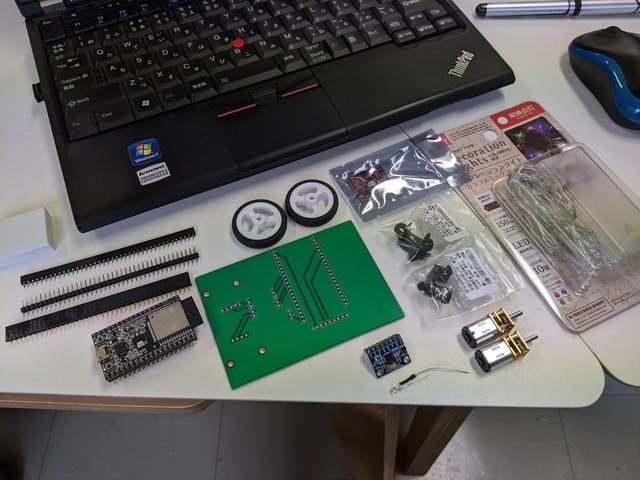 ESP32の開発ボードを中心として、MPU-6050 3軸ジャイロ加速度センサー、モータードライバ、ギヤ付きの小型モータ、車輪、ベースとなる基板、電池ボックスといったシンプルなものです。