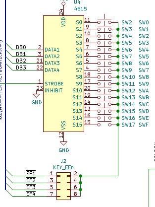 さらにMCSMP20のシリアル入力とHEXキーボード入力が衝突しないように、HEXキーボードをEF4接続に変更しました。これを想定してSTG1861+HEXKEY基板でもキーボードの信号をEF1~4から選択できるようにしておいたので、J2のジャンパをEF3からEF4に変更すれば、ハードウェアの対応は完了です。