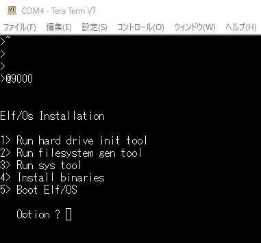 この状態で電源をいれ、シリアルコンソールでEnterをしたところ > のプロンプトが表示されました。一応動作しているようです。続けて @9000と入力して、Elf/OSのインストーラーを起動します。