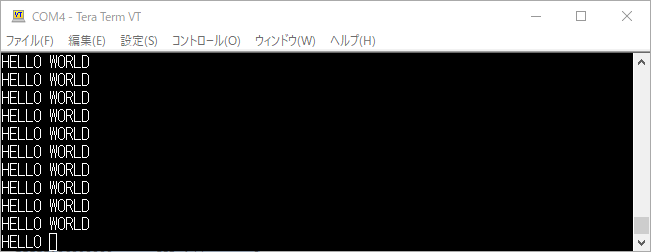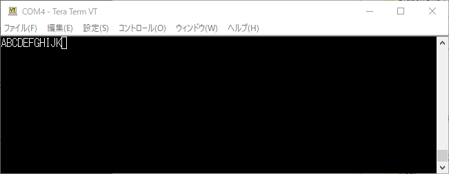 次は入力の確認です。UART受信レジスタに読み込んだ文字をそのままUART送信レジスタに出力します。キーボードから入力した文字がそのままターミナルに表示されるはずです。