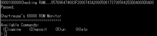 移植したモニタをSレコードからBレコードに変換したあとに、ブートローダーで読み込ませたところ無事モニタが起動しました。メモリチェック機能もあるようです。