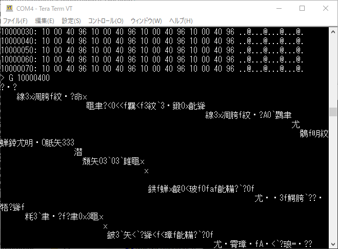 これは、シリアル通信の速度が一致していない場合によく見る文字化けです。何行か続いて表示されているようにみえます。すぐ出力が終わってしまうので通信速度は合わせられませんでした。
