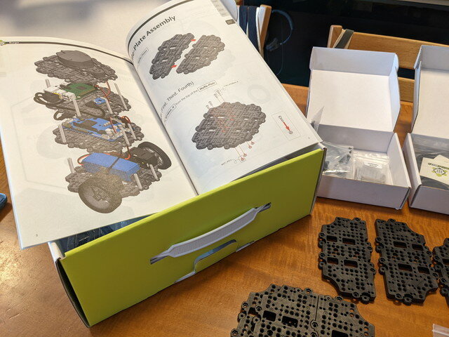 TurtleBot3 Burgerのパーツ確認が終わったところで組み立て開始です。マニュアルを外箱に載せて見ながら作業します。