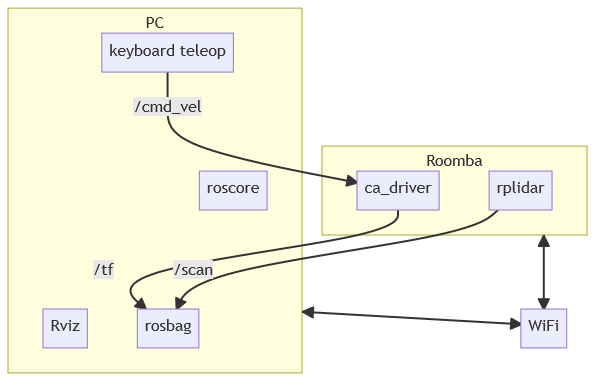 これまではRaspberry Pi 4ですべてのノードを動かしていましたが、turtlebot3と同様にRaspberry Piでは最低限のドライバだけ動かして、データの収集や可視化はPCで行うように変更しました。
