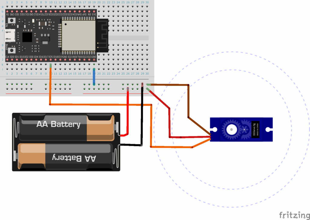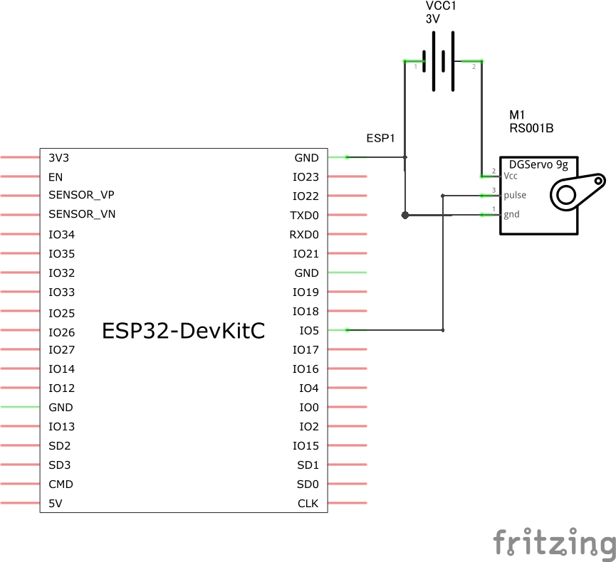 ESP32-DEVKITCとサーボモーターの回路図は以下のようにしました。IO5の信号でモーターの回転角を制御します。