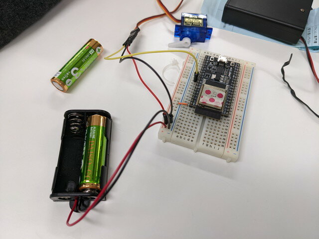 うまくESP32に書き込めれば、サーボモーターが90°ごとに動くことがわかります。
