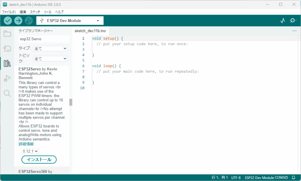サーボモーター用のライブラリが用意されているのでこれを使います。何種類かありますが、今回はESP32Servoを使います。