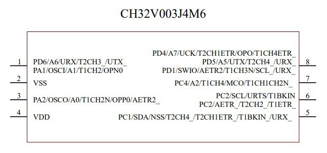 マイコンのピンは以下のような配列になっています。たった8ピンですが、いろんな機能が使えることがわかります。(CH32V003データシートから引用)