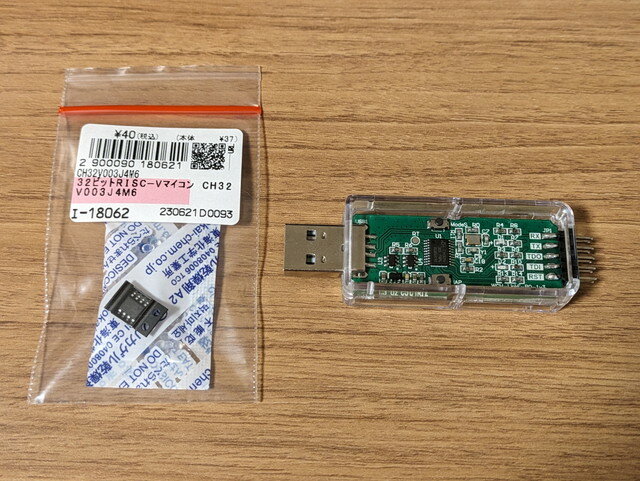他にも1個50円のCH32V003F4P6 \[販売コード:118061\]もあり、こちらはピン数も多く高機能のようですが、まずはSOP8で扱いやすそうなCH32V003J4M6で試してみます。マイコンに書き込むためのツールのWCH-LinkEエミュレータ \[販売コード:118065\]も販売されていましたのでこちらも購入しました。