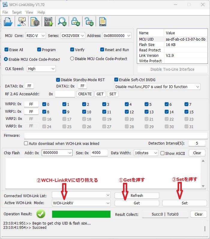 この状態でQuery Chip Infoボタンを押して、接続しているマイコンの情報が表示されれば正常に動作しています。これでターゲットとなるマイコンとWCH-LinkEの接続は完了です。