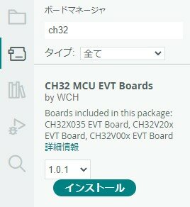 あとはボードマネージャーでch32で検索してCH32 MCU EVT Boardsを選択してインストールします。