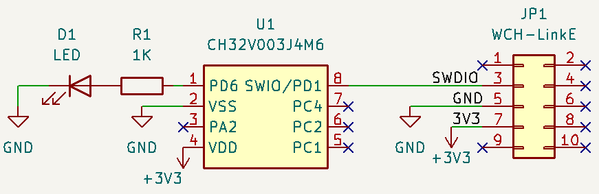 WCH-LinkEとはダウンロードに必要なSWDIOと3.3V、GNDを接続します。これ一つでターゲットとなるマイコンへの電源供給もできて便利です。