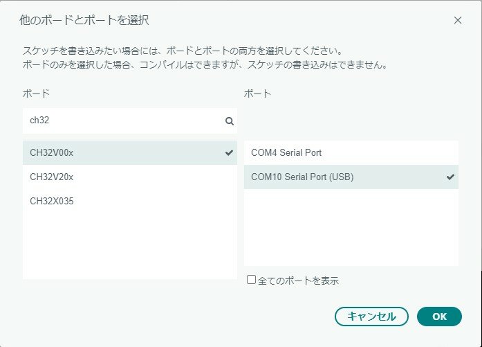 ボードはCH32V00xを選択し、ポートはWCH-LinkEが割り当てられているCOMxを設定します。私の場合はCOM10にみえました。